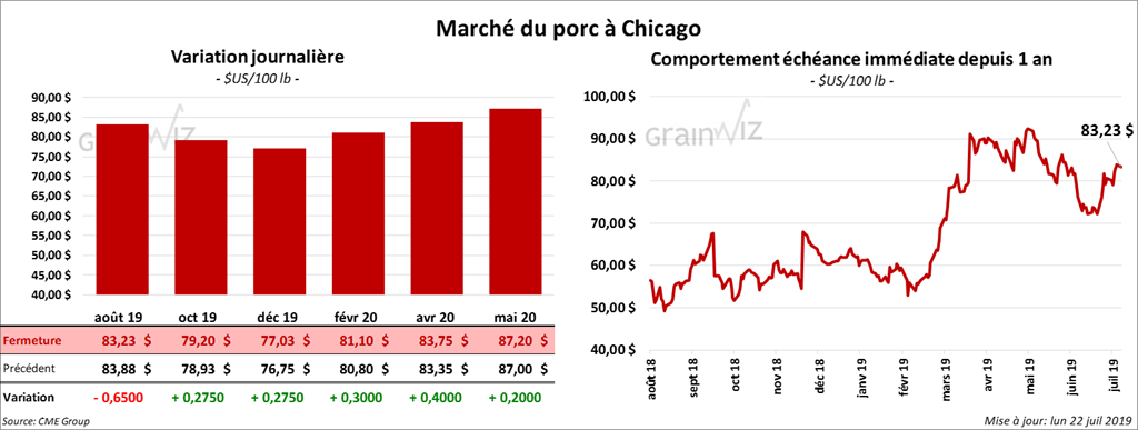 Le 18 juillet dernier, le CME Lean Hog Index était en hausse de 88 cents par rapport au jour précédent à 72,40 $. Cet après-midi, la valeur moyenne des découpes a augmenté de 2,08 $ à 80,61 $. Toutes les découpes étaient en progression. Sur une base nationale, le prix moyen au comptant de la carcasse a été en hausse de 3,78 $ à 76,02 $.