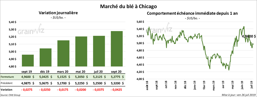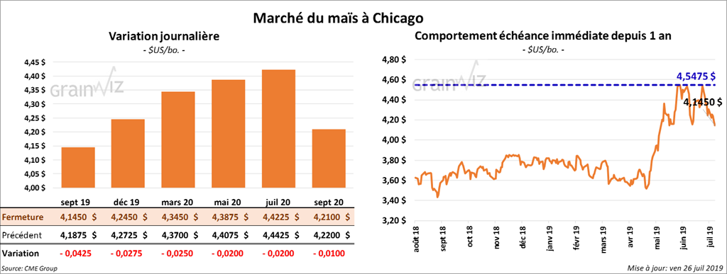 La plupart des contrats de maïs à Chicago ont terminé la journée en baisse de 2 à 4 cents. Pour la semaine, le contrat septembre 19 a reculé de 3,77 %.