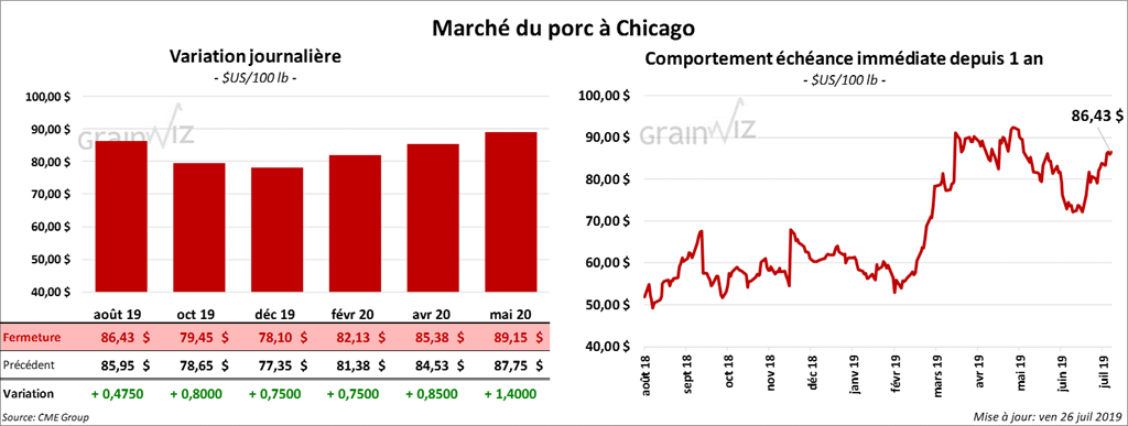 La plupart des contrats de porc à Chicago ont clôturé avec des gains de 45 cents à 1,40 $. Pour la semaine, le contrat août a progressé de 3,04 %.