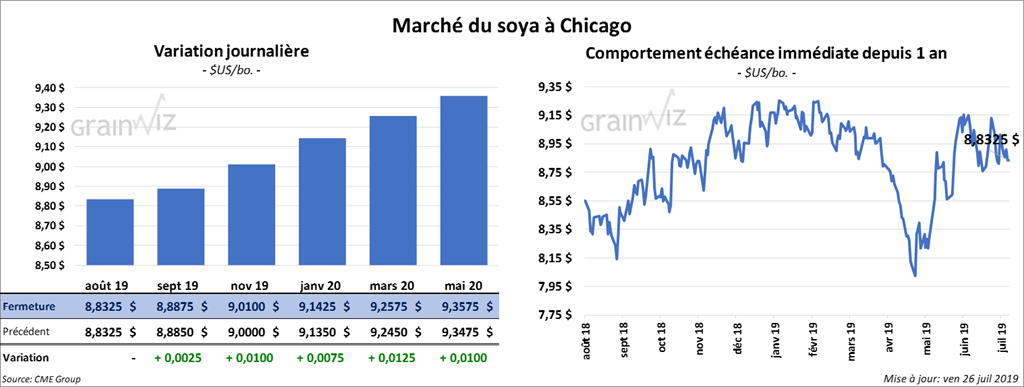 La majorité des contrats de soya US ont fini la session en hausse d’une fraction à 1 ¼ cents. Pour la semaine, le contrat août 19 a reculé de 2 %. Le contrat de tourteau août 19 a clôturé en hausse de 80 cents/tonne. L’huile a gagné 20 points.