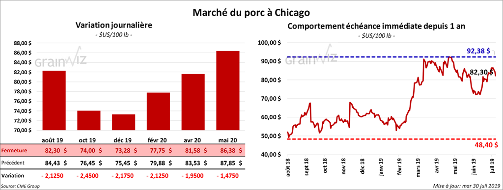 Le 26 juillet dernier, le CME Lean Hog Index était en progression de 1,50 $ par rapport au jour précédent à 80,36 $. Cet après-midi, la valeur moyenne des découpes a été en hausse de 3,05 $ à 87,09 $. La progression provenait du jambon (+8,72) et du flanc (+3,77). Sur une base nationale, le prix moyen au comptant de la carcasse était en hausse de 64 cents à 82,54 $.