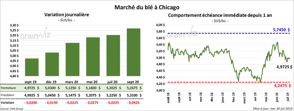 La plupart des contrats de blé ont fini la journée dans le rouge de 1 à 6 ¼ cents. La faiblesse des autres secteurs du grain a pesé sur les marchés.