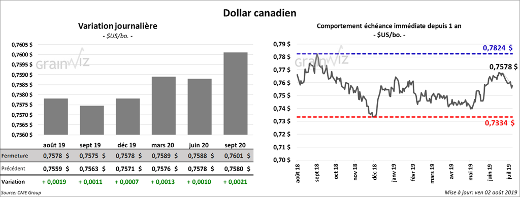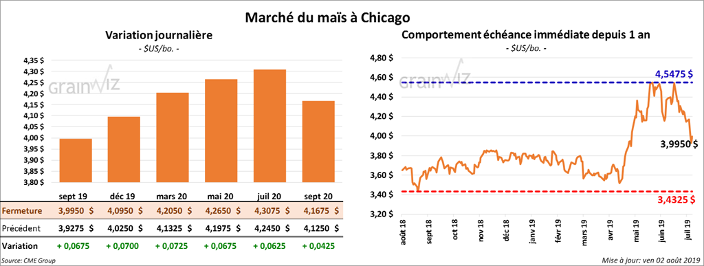 Ce matin, le Census Bureau a rapporté que les exportations de maïs durant le mois de juin dernier ont été de 3,069 millions de tonnes. Il s’agit du total, pour un mois de juin, le plus faible depuis 2013. C’est également une baisse de 24,56 % par rapport à mai et une autre de 57,27 % comparativement au record de juin 2018. Toujours pour le mois de juin dernier, les exportations de la drèche US ont été de 962,592 tonnes. Celles de l’éthanol US ont été de 128,42 millions gallons, ce qui représente un record après celles de juin 2018. Après la fermeture hier, le USDA a indiqué que 456,576 millions de boisseaux de maïs US ont été utilisés dans la production de l’éthanol US au cours du mois de juin dernier.