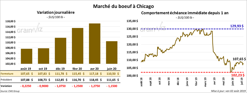 La majorité des contrats de bœuf US ont clôturé en baisse de 22,5 cents à 1,075 $. Les contrats de veau aux échéances les plus rapprochées ont fait de même en clôturant dans le rouge de 1,60 $ à 3,55 $.