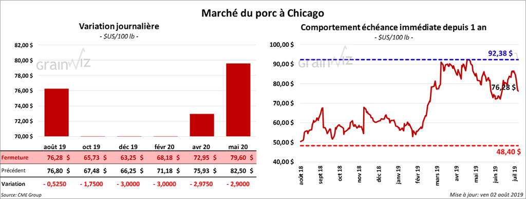 Les contrats de porc US ont fini la session en baisse de 1,75 $ à une limite de 3 $. À l’approche de son expiration prévue le 14 août prochain, le contrat août 19 a perdu 52,2 cents. Pour la semaine, il a reculé de 11,46 % alors que celui octobre 19 a perdu 18,54 %.