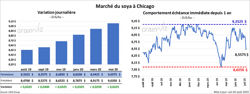 Les contrats de soya US aux échéances les plus rapprochées ont fini la session en hausse de 3 à 3 ¼ cents. Le contrat août 19 a clôturé en baisse de 80 cents/tonne. L’huile a gagné 51 points.
