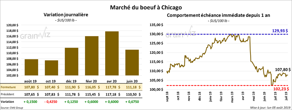 Les contrats de bœuf à Chicago ont fini la journée sur une note partagée. Le contrat août 19 a clôturé en hausse de 15 cents. Les contrats de veau aux échéances les plus rapprochées ont terminé en progression de 90 cents à 4,175 $.