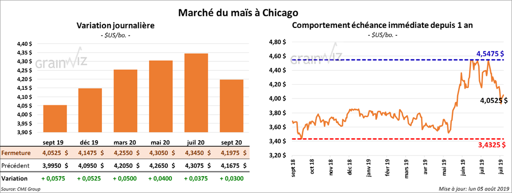 La majorité des contrats de maïs US aux échéances les plus rapprochées ont terminé la journée en hausse de 4 à 5 ¾ cents.