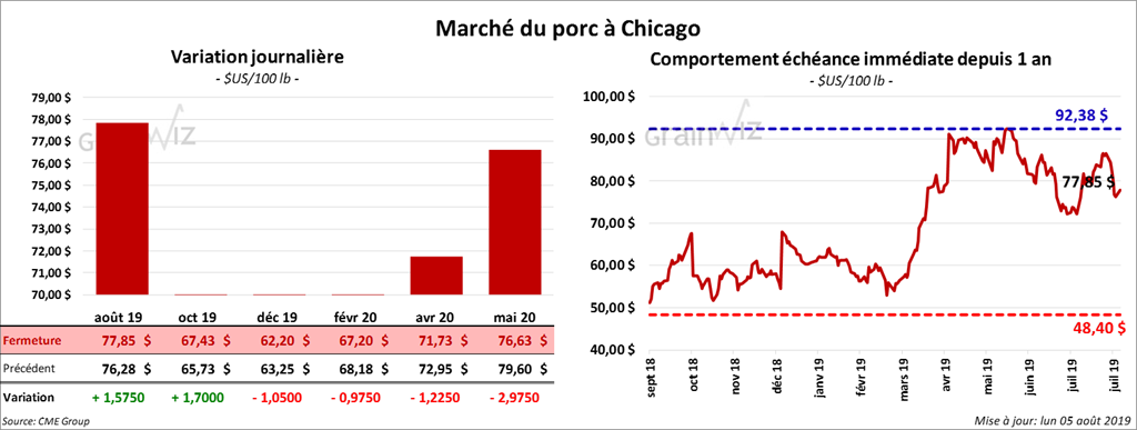 Les contrats de porc US aux échéances les plus rapprochées ont fini la journée en hausse de 1,575 à 1,70 $. Plusieurs contrats différés ont atteint leurs limites les plus basses à 4,50 $ avant de clôturer en baisse.