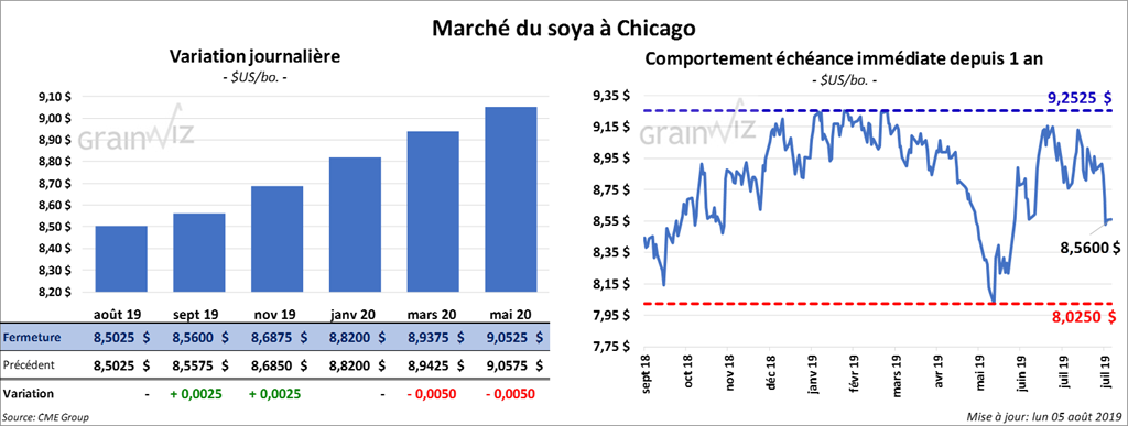 Les contrats de soya US ont fini la session inchangée. Ils avaient reculé de 13 et 14 cents un peu plus tôt durant la séance. Le contrat de tourteau août 19 a clôturé en hausse de 2,50 $/tonne. L’huile a reculé de 43 points.