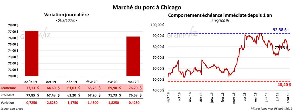 Les contrats de porc à Chicago ont terminé la session en baisse de 725 cents à 2,825 $