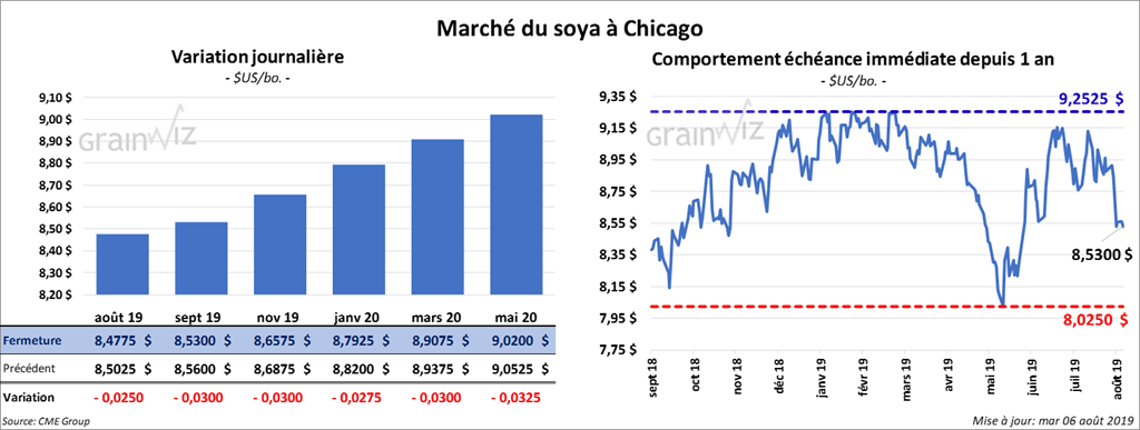 Les contrats de soya aux échéances les plus rapprochées ont terminé la journée dans le rouge de 2 ½ à 3 cents. Le contrat de tourteau août 19 ont fini en hausse de 20 cents/tonne. L’huile a reculé de 28 points.