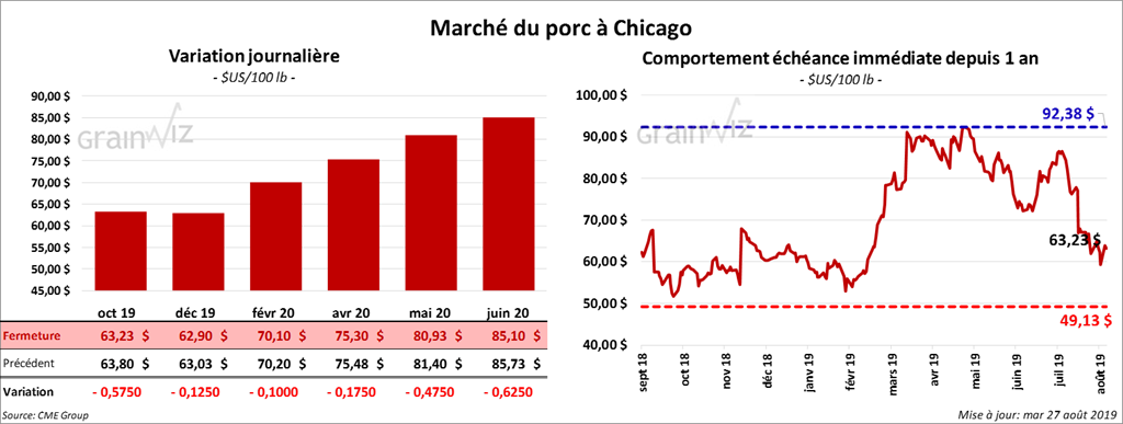 Le 23 août dernier, le CME Lean Hog Index était en baisse de 1,44 $ à 74.50 $. Cet après-midi, la valeur moyenne des découpes de porc a été en recul de 4,92 $ à 74,07 $. La baisse observée dans le flanc (27,41 $) était la principale cause du repli. À noter qu’il s’agit d’une diminution record pour une seule journée. Sur une base nationale, le prix moyen a comptant de la carcasse était en baisse de 1,14 $ à 61, 57 $.