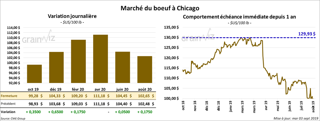 Poussés par celui décembre 2019, les contrats de bœuf à Chicago ont terminé au neutre à haussier de 65 cents. Dirigés par celui septembre 19, les contrats de veau ont clôturé en hausse de 0,35 $ à 1,75 $.