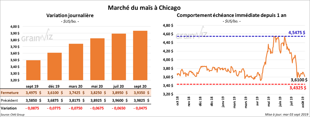 Les contrats de maïs US ont terminé la session en baisse de 7 à 8 ¾ cents. Ceux de 2019/2020 ont touché leurs niveaux les plus bas.