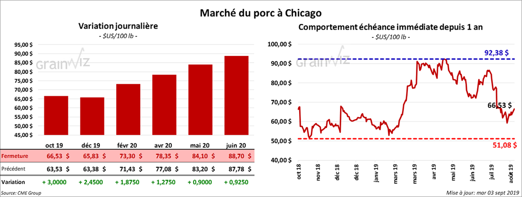 Jusqu’en août 2020, les contrats de porc US ont fini la journée en progression de 0,90 $ à 3,00 $. Le contrat octobre 2019 était le seul à sa limite à la hausse.