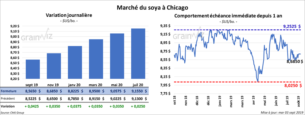 Le rapport mensuel Fats & Oils présenté par le USDA signale que 179,5 millions de boisseaux de soya ont été triturés au cours du mois de juillet dernier. Sur une base annuelle, c’est une légère hausse. Il s’agit aussi d’une augmentation de 13,88 % par rapport à juin. Le total des inventaires d’huile a progressé à 2,039 milliards de lbs.et dépasse les attentes de marché.