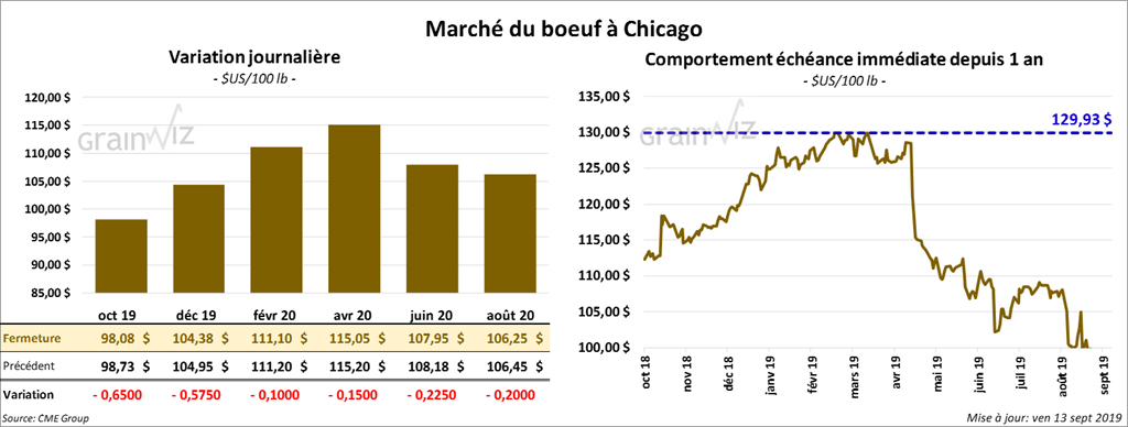 La majorité des contrats de bœuf à Chicago ont terminé la journée avec des pertes de 10 à 65 cents. Sur la semaine, le contrat octobre 19 a reculé de 3,37 %. Les contrats de veau US ont fini sur une note partagée. Le contrat septembre 19 a perdu 35 cents. Les autres contrats aux échéances les plus rapprochées ont clôturé au neutre à haussier de 12,5 cents.