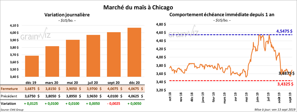 La plupart des contrats de maïs ont terminé la session en hausse de 1 ¾ cents. Sur la semaine, le contrat décembre 19 a progressé de 3,73 %.