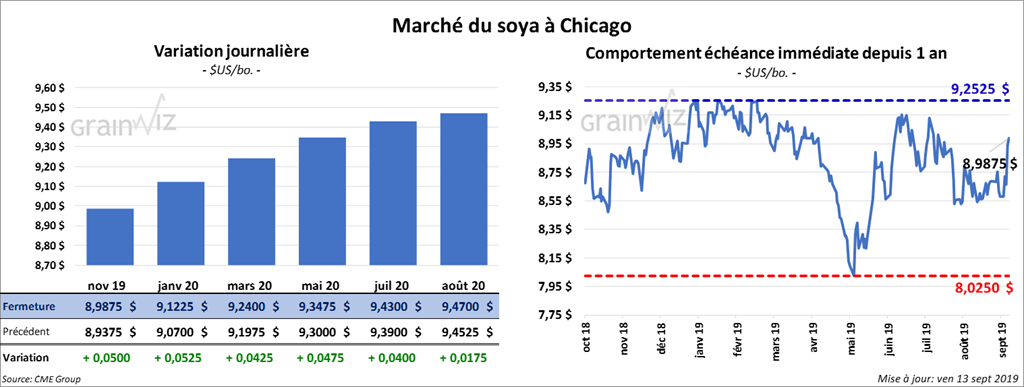 Les contrats de soya à Chicago ont fini la journée avec des gains de 1 à 3 ¼ cents. Sur la semaine, le contrat novembre 19 a gagné 4,78 %.