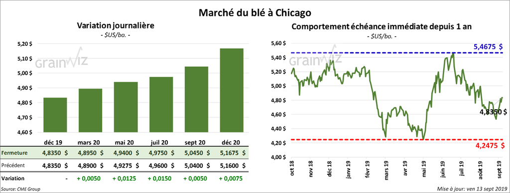Sous l’effet de prises de profits avant le week-end, la plupart des contrats de blé à Kansas et à Minneapolis ont fini la séance au neutre à baissier de 4 cents. À Chicago, par contre, ils ont clôturé en légère hausse. Sur la semaine, le contrat de Chicago décembre 19 a progressé de 4,26 %. À Kansas, le même contrat a pris 1,53 %. À Minneapolis, la progression a été de 2,12 %.