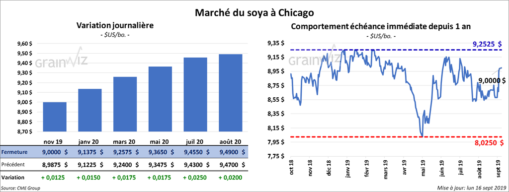 Les contrats de soya US aux échéances les plus rapprochées ont fini la session en hausse de 1 à 2 cents. Par contre, le tourteau a reculé de 2,70 $/tonne. Les inventaires à la baisse du NOPA ont poussé l’huile de soya en progression de 85 points.