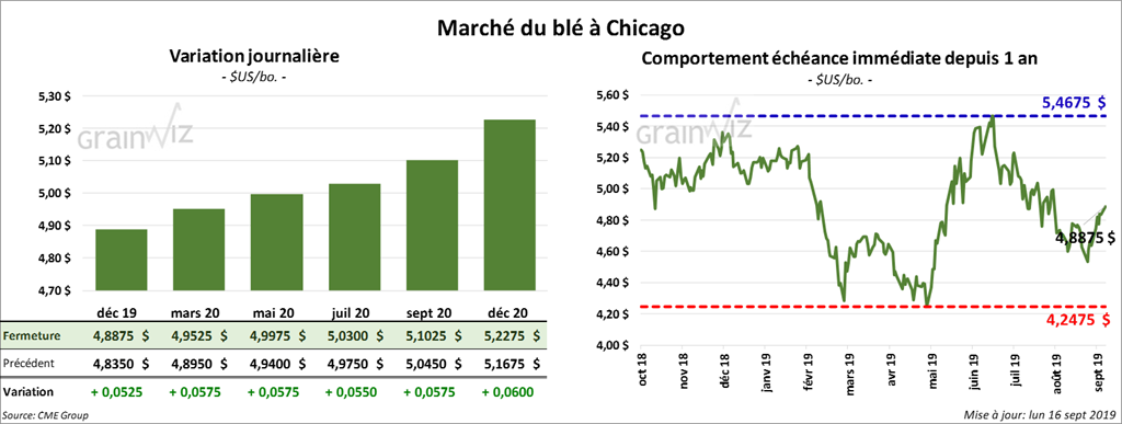 Le rapport sur les inspections à l’exportation de la semaine du 12 septembre dernier indique que celles de blé US ont été de 459,258 tonnes, ce qui correspond à une augmentation hebdomadaire de 11,31 %. Le résultat excède également celui de l’an dernier par 11,70 %. Les expéditions de blé US ont totalisé 7,47 millions de tonnes, soit une augmentation de 22,13 % comparativement à la même période en 2018.