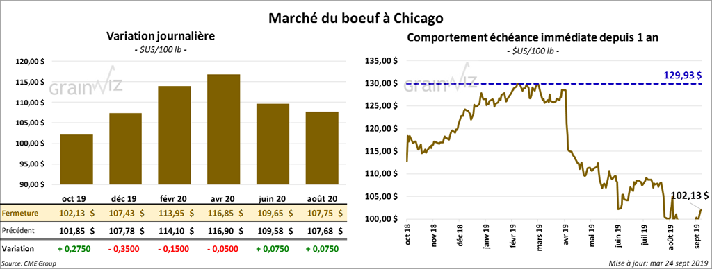 Les contrats de bœuf US ont terminé la journée sur une note partagée, mais la plupart d’entre eux ont clôturé au neutre de 35 cents. Les contrats de veau US ont fini la session en hausse de 40 à 70 cents. Le contrats septembre 19, qui va expirer bientôt, a terminé en baisse de 35 cents.