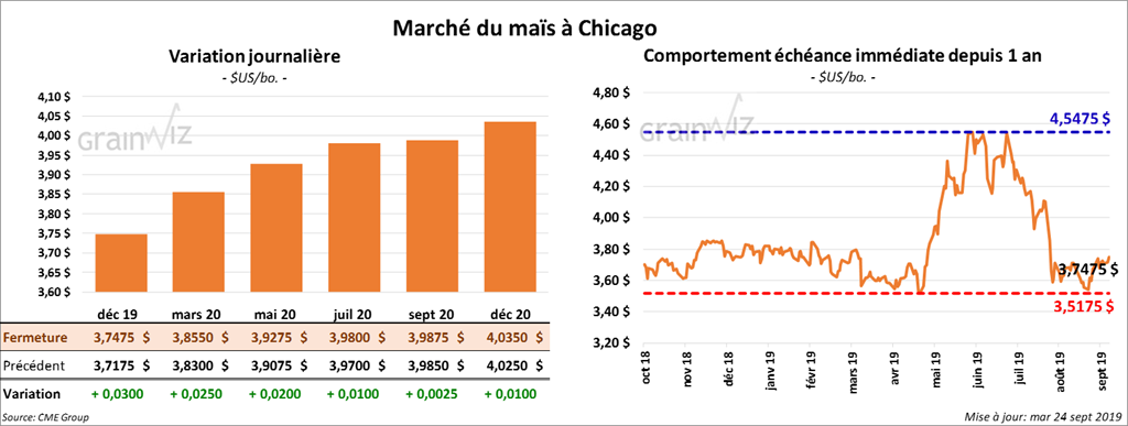 Les contrats de maïs US aux échéances les plus rapprochées ont fini la session en hausse d’une fraction à 1 ½ cents.