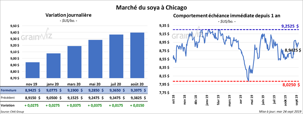 Le USDA devrait présenter son rapport trimestriel sur les grains lundi prochain et les analystes pensent que les inventaires de soya US en date du 1er septembre devaient être de 982 millions de boisseaux. Un sondage de Reuters montre que les analystes s’attendent à ce que la production de soya US 2019 soit en baisse de 16 millions de boisseaux à 4,528 milliards de boisseaux.