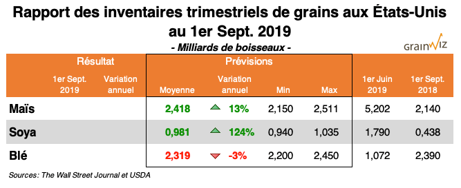 Comme il s'agit des stocks au 1er septembre, pour les maïs et soya, ils serviront de nouveau point de départ pour les stocks finaux de la dernière année (2018-19), et les nouveaux de la nouvelle année commerciale 2019-20.