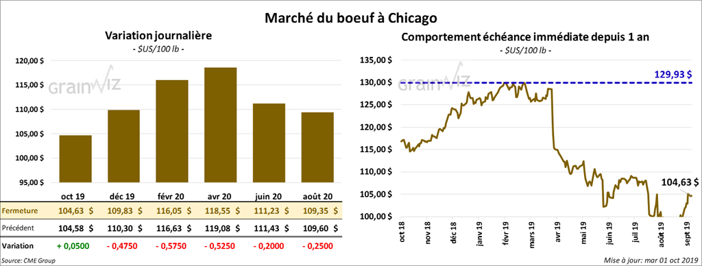 Le contrat de bœuf US octobre 19 a fini en hausse de 5 cents, mais les autres contrats ont clôturé en baisse de 15 à 57,5 cents. L’option octobre 19 expire vendredi. Les contrats de veau US ont terminé la séance en recul de 1,30 $ à 1,725 $.