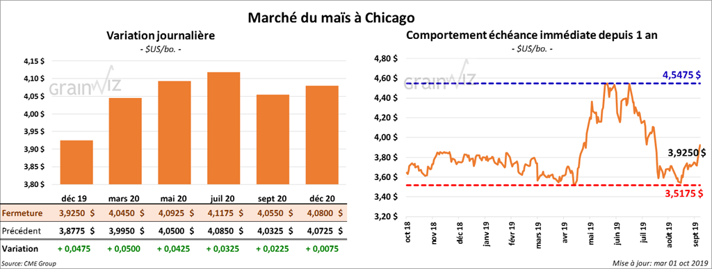 Les contrats de maïs à Chicago ont terminé la session avec des gains de 4 ½ cents à 3,92 $.