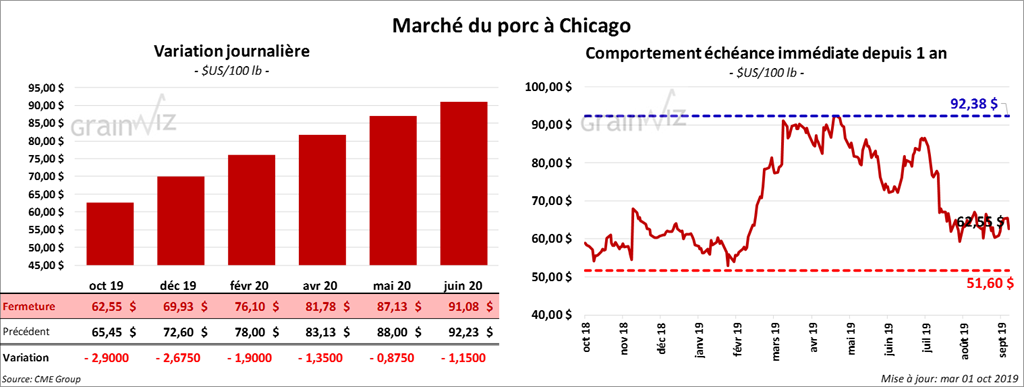 Les contrats de porc à Chicago ont fini la session en baisse de 2,90 $ à 62,55 $.