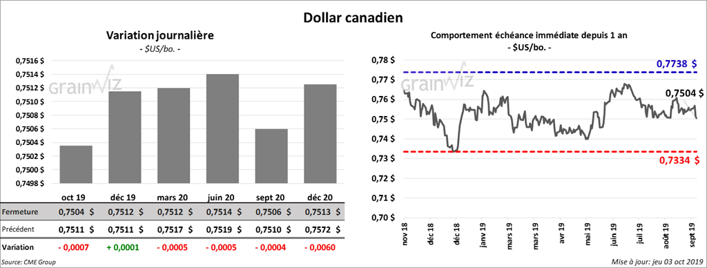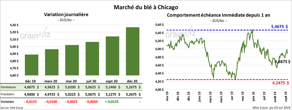 La journée s’est complétée avec un minimum d’activité. Les contrats décembre 19 de blé dur rouge d’hiver US et de blé dur rouge de printemps US ont tout deux terminé la journée inchangés. Toutefois, le contrat de blé tendre rouge d’hiver US a fini la session en baisse de ¼ cent.