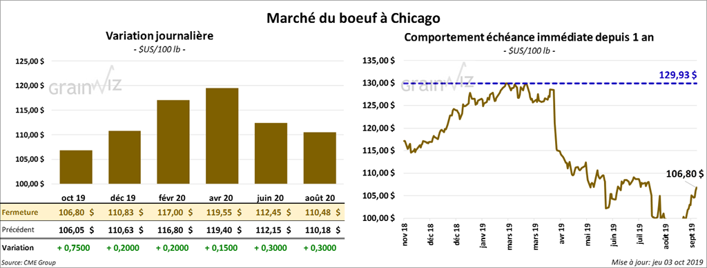 Les contrats de bœuf US ont fini la journée dans le vert de 15 à 75 cents. Quelques ventes au comptant à 106 $ ont été rapportées dans le sud des États-Unis. Les options octobre 19 expirent demain. Les contrats de veau US aux échéances les plus rapprochées ont terminé la session en hausse de 25 à 42 cents.