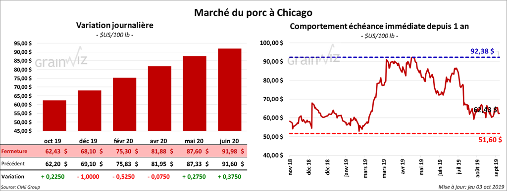 Le contrat de porc US octobre 19 a terminé la session avec des gains de 22,5 cents, mais le contrat décembre 19 a reculé de près de 1 $.