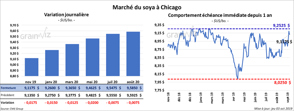 Les contrats de soya US aux échéances les plus rapprochées ont fini la journée en baisse de 1 à 2 cents. Le tourteau a également clôturé en baisse de 2,30 $/tonne. L’huile a gagné 74 points.