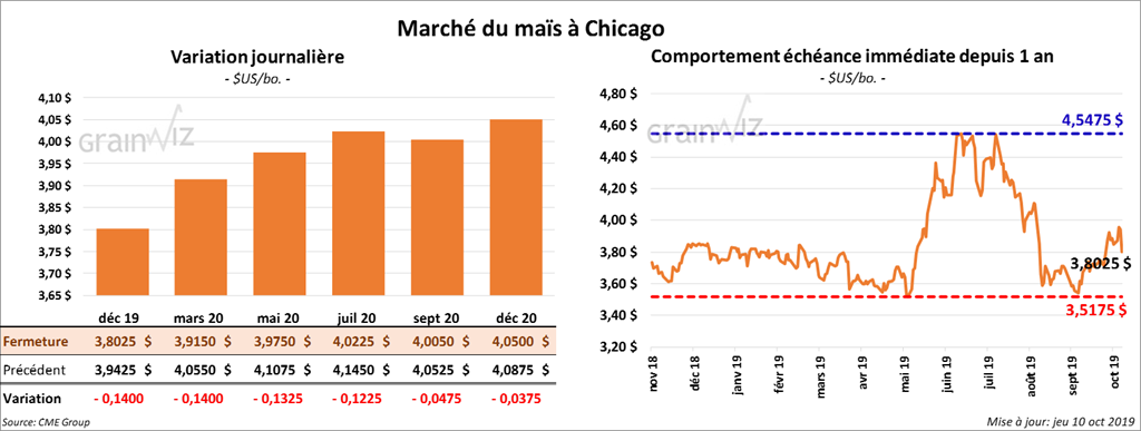 Ce matin, le rapport sur la production de grain indiquait que le rendement de maïs US 2019 est actuellement projeté à la hausse de 0,2 bo./acre par rapport à septembre dernier à 168,4 bo./acre. Le résultat est également supérieur aux attentes de marché par 0,9 bo./acre. En ce qui concerne la production de maïs US, le NASS (USDA) l’évalue à la baisse par rapport au mois dernier de 20 millions de boisseaux à 13,779 milliards de boisseaux. Il estime la superficie récoltée en diminution à 81,8 millions d’acres. Quant aux inventaires de maïs US 2019/2020, le NASS, estime qu’ils sont en baisse de 261 millions de boisseaux à 1,929 milliard de boisseaux. Le marché s’attendait plutôt à 1,68 milliard de boisseaux.