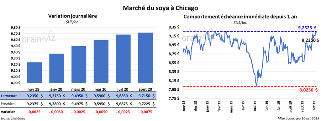 Dans son rapport d’offre et de demande, le NASS projette le rendement de soya US à la baisse de 1 bo./acre à 46,9 bo./acre. Cette réduction a engendré celle de la production de 83 millions de boisseaux par rapport à septembre dernier à 3,550 milliards de boisseaux. Avec l’aide de la baisse des inventaires de soya US 2018/2019 et de celle de la production, les stocks de soya US 2019/2020 ont reculé de 180 millions de boisseaux comparativement au rapport précédent à 460 millions de boisseaux.