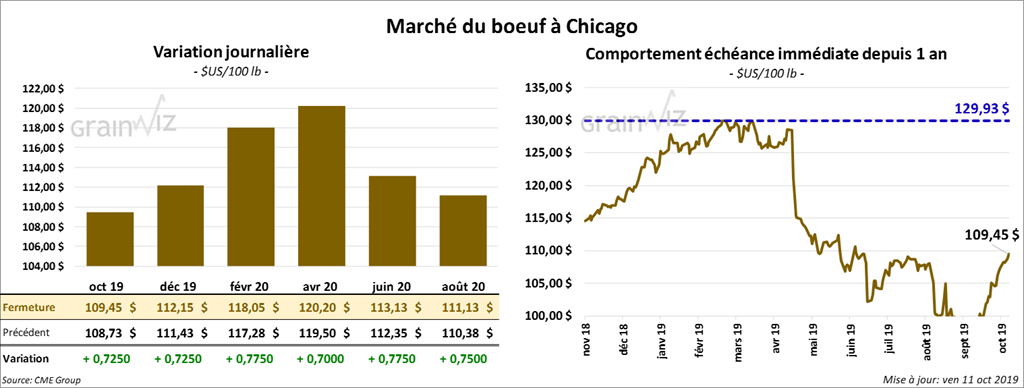 Les contrats de bœuf US ont fini la journée avec des gains de 72 à 77 ½ cents. Les contrats de veau US ont terminé sur une note partagée. Le contrat octobre 19 a clôturé dans le rouge de 20 cents, mais celui novembre 19 a terminé en hausse de 12 ½ cents. La forte augmentation des prix du maïs US a limité celle des contrats de veau US.