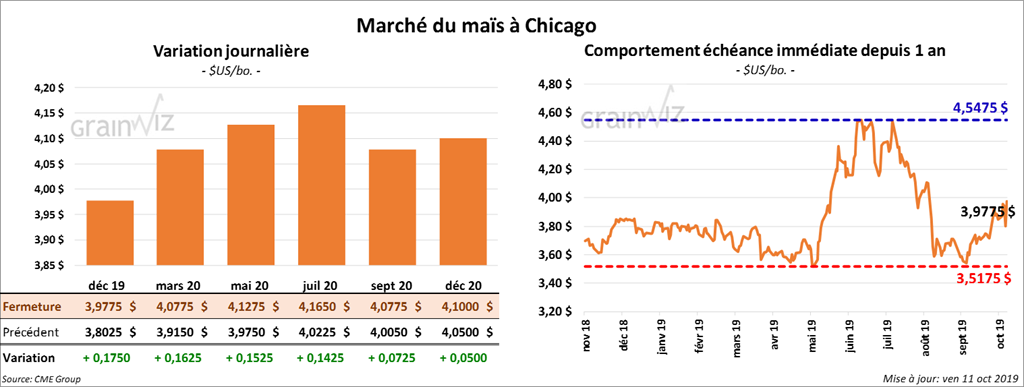 Les contrats de maïs US ont terminé la journée avec des gains à 2 chiffres. Le contrat décembre 19 a gagné 17 ½ cents.