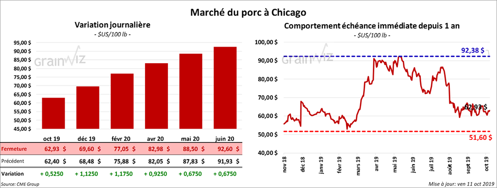 Le 9 octobre dernier, le CME Lean Hog Index était en hausse de 53 cents à 60,65 $. Cet après-midi, la valeur moyenne des découpes a été en progression de 61 cents à 77,52 $. Sur une base nationale, le prix moyen au comptant de la carcasse était en hausse de 69 cents à 56,27 $.