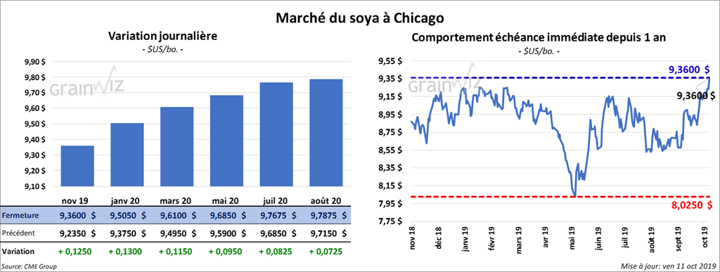 Les contrats de soya US aux échéances les plus rapprochées ont fini la session avec des gains de 9 ½ à 13 cents. Graphiquement, ils sont à leurs plus haut niveau depuis le 22 juin 2018. Le tourteau a aussi terminé la journée en hausse de 2,80 $/tonne. L’huile a pris 13 points.