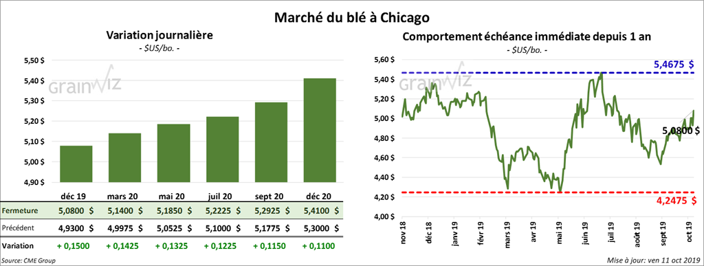 Les contrats de blé US aux échéances les plus rapprochées ont clôturé avec des gains à deux chiffres. Le contrat décembre 19 concernant le blé dur rouge d’hiver US a influencé les marchés pour finir à la hausse de 16 ¼ cents.