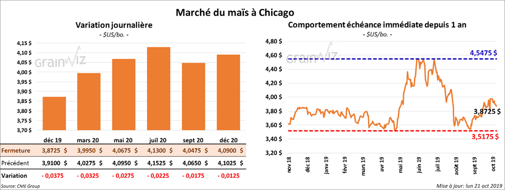 Les contrats de maïs US aux échéances les plus rapprochées ont fini la session en baisse de 2 ½ à 3 ¾ cents.