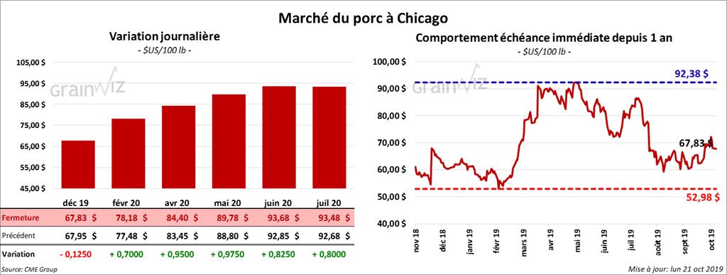Le 17 octobre dernier, le CME Lean Hog Index était en hausse de 74 cents à 65,64 $. Cet après-midi, la valeur moyenne des découpes a été en progression de 1,50 $ à 78,53 $. Sur une base nationale, le prix moyen au comptant de la carcasse était en hausse de 24 cents à 56,94 $.