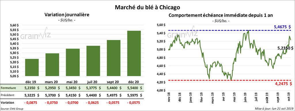 Les contrats de blé d’hiver US ont terminé la journée en baisse de 8 ¾ cents. Ceux de blé de printemps US ont également fini en recul de 6 ¾ cents.