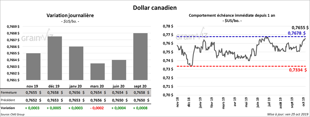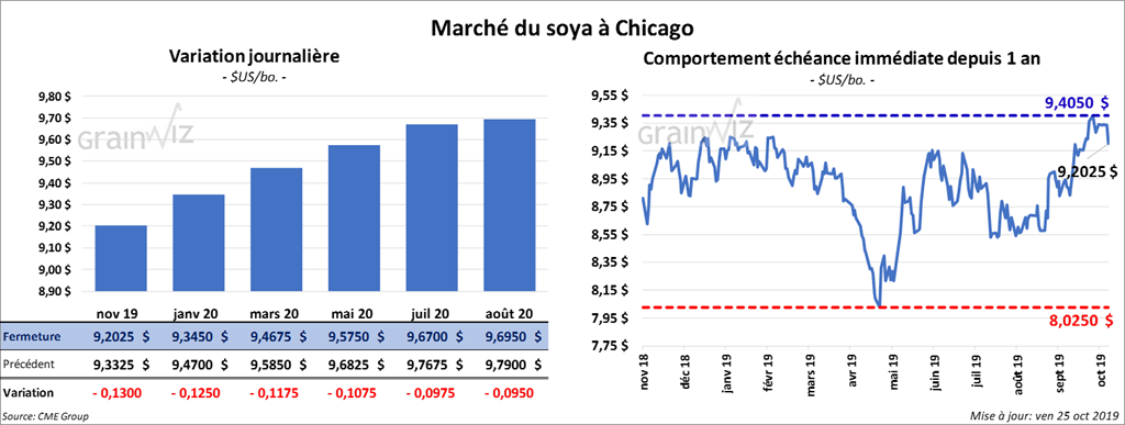 Les contrats de soya US ont terminé la journée en baisse de 10 ¾ à 13 cents. Sur la semaine, le contrat novembre 19 a perdu 13 ¾ cents. Les options novembre 19 expiraient aujourd’hui. Le tourteau a reculé de 2,30 $/tonne. Pour la semaine, l’huile a gagné 60 points, mais elle a fini la session dans le rouge.