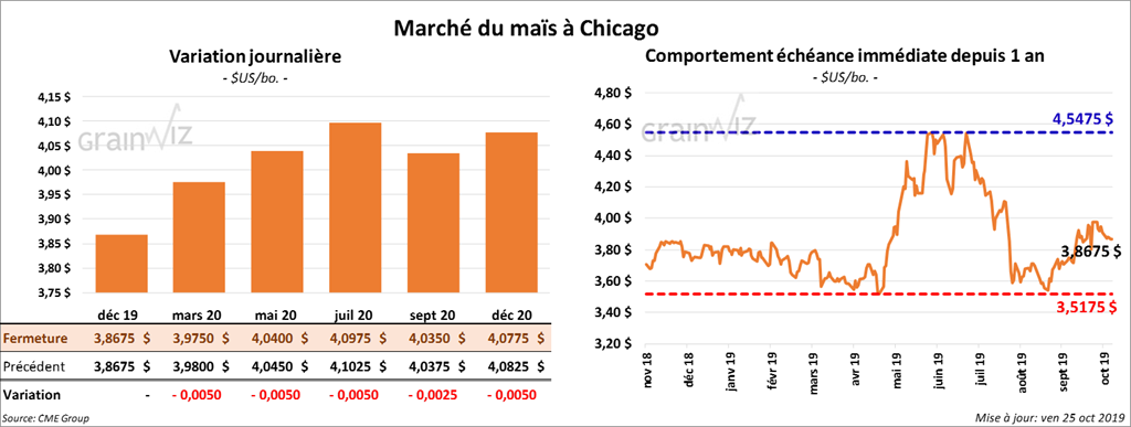 À la fermeture du marché, les contrats de maïs US avaient perdu leurs gains de ce midi. Celui décembre 19 a reculé de 4 ¼ cents.